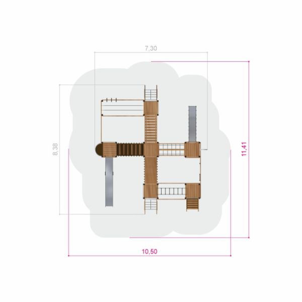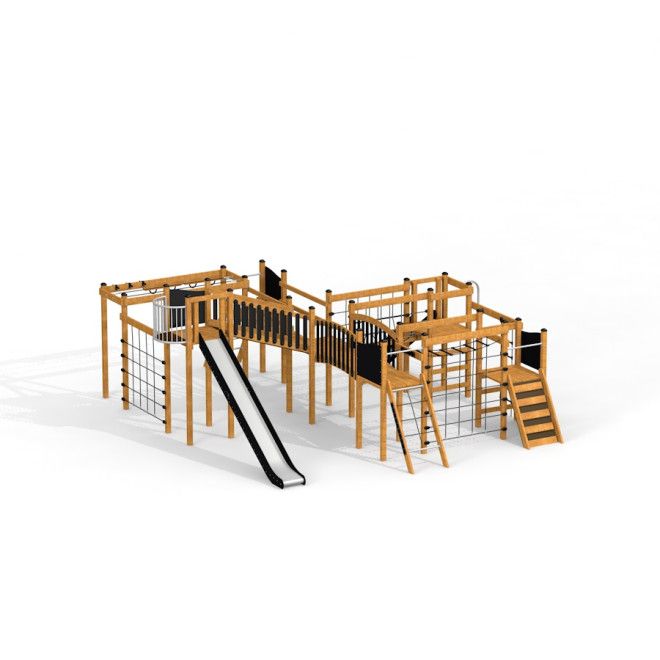 Denna lekutrustning är tillverkad av lärkträ, rostfritt stål, galvaniserat stål samt återvunnen HDPE. Konstruktionen kompletteras av polypropenrep med stålkärna, mjukt PP-rep, halkskyddad vattentålig plywood, PP och PE. Varje komponent är noggrant utvald för att säkerställa lång livslängd, hållbarhet och minimalt underhåll, samtidigt som den naturliga känslan bevaras.