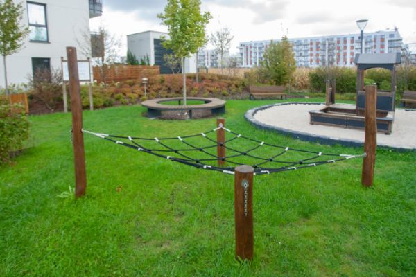 Komodo är tillverkad av robust robinieträ och slitstarka polypropenrep med stålkärna. Denna kombination garanterar långvarig hållbarhet och en naturlig estetik, vilket gör att produkten smälter harmoniskt in i omgivande grönska. Materialvalet säkerställer också motståndskraft mot väderpåverkan och intensiv användning.
