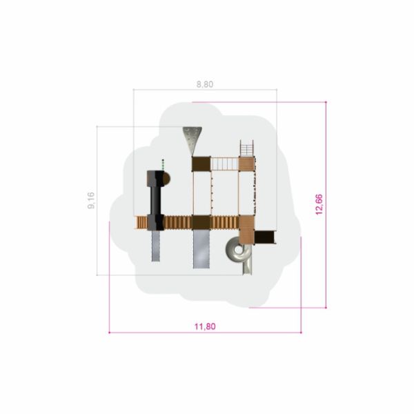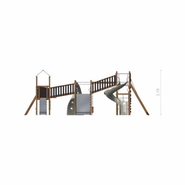 Lekplatsen är anpassad för barn från 3 år och uppåt och erbjuder flera plattformshöjder som ger variation och utmaning för olika åldersgrupper. Den är utformad för att uppfylla höga säkerhetskrav enligt EN 1176-1:2017, vilket innebär att alla komponenter är noggrant testade och anpassade för trygg lek. Den genomtänkta konstruktionen och de halkskyddade ytorna minimerar risken för olyckor, och fallskyddsunderlag rekommenderas för maximal säkerhet.