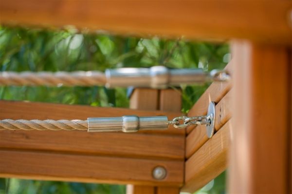 Oden är byggd av lärkträ, rostfritt stål, galvaniserat stål samt återvunnen HDPE. Polypropenrep med stålkärna, glasfiber, halkskyddad vattentålig plywood och PE-material bidrar till en slitstark och hållbar helhet. Kombinationen av naturliga och moderna material garanterar lång livslängd och ett säkert stöd för lekande barn.