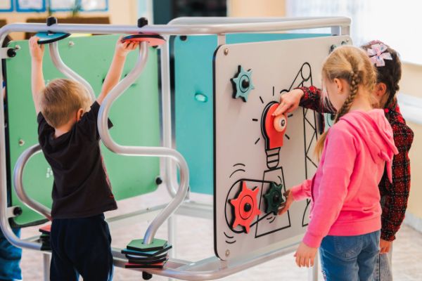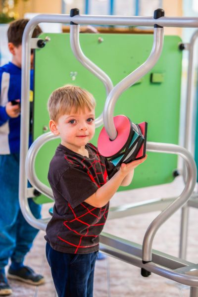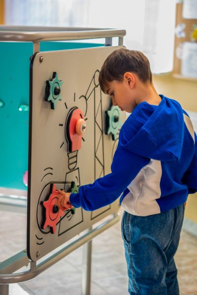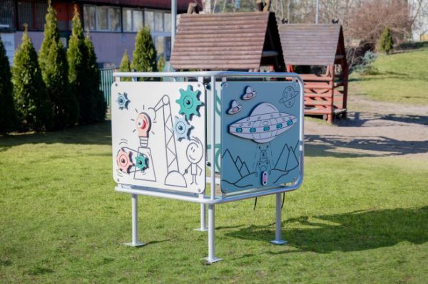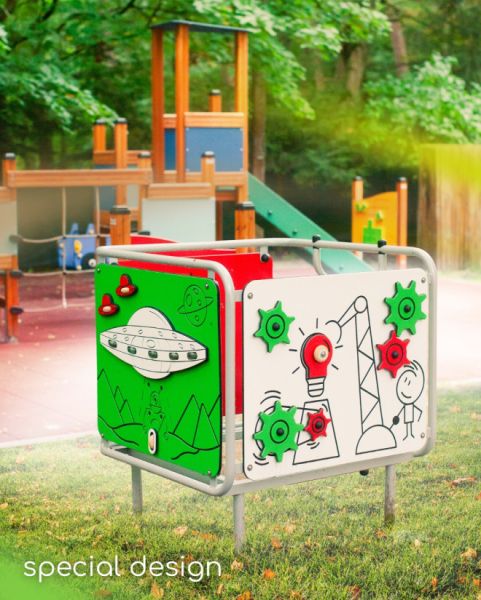 Idéal pour les aires de jeux d’intérieur ou d’extérieur, ce module sensoriel invite les enfants à explorer, manipuler et découvrir à travers des activités tactiles et visuelles. Il favorise le développement moteur et cognitif tout en encourageant le jeu social.