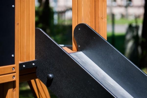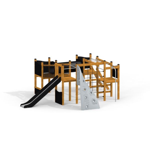 Denna lekställning är tillverkad av lärkträ, rostfritt stål, galvaniserat stål, återvunnen HDPE, polypropenrep med stålkärna, LLDPE och PE. Kombinationen av dessa material garanterar långvarig hållbarhet och utmärkt motståndskraft mot både intensiv användning och väderpåverkan. Varje detalj är noggrant genomtänkt för att ge stabilitet och säkerhet i varje moment av leken.