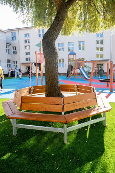 Träbänk I Lärk passar utmärkt i parker, lekplatser, skolgårdar och offentliga utemiljöer. Dess cirkulära form bjuder in till samtal och gemenskap, och blir snabbt en naturlig mötesplats i varje rekreativ miljö.