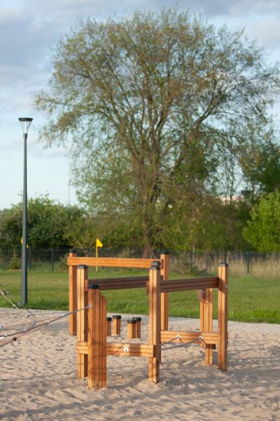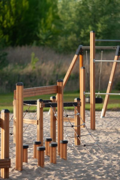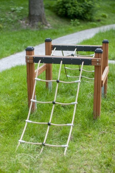 Trim trail är tillverkad av lärkträ, återvunnen HDPE, polypropenrep med stålkärna, rostfri stålkedja och PE. Den noggrant utvalda materialkombinationen garanterar hög hållbarhet, väderbeständighet och lång livslängd, även vid intensiv användning på offentliga platser.